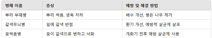 - 배수가 불량한 토양에서는 뿌리 부패 발생 가능