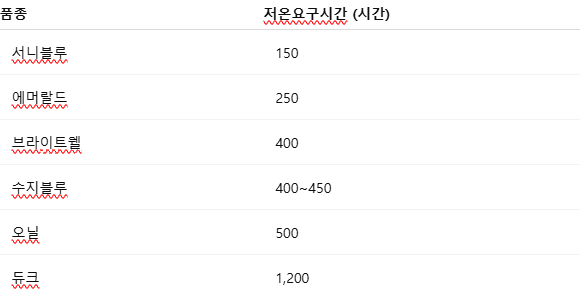 [2. 품종별 저온요구시간 정리] 블루베리는 품종마다 요구하는 저온시간이 다릅니다. 아래 표를 참고해보세요.